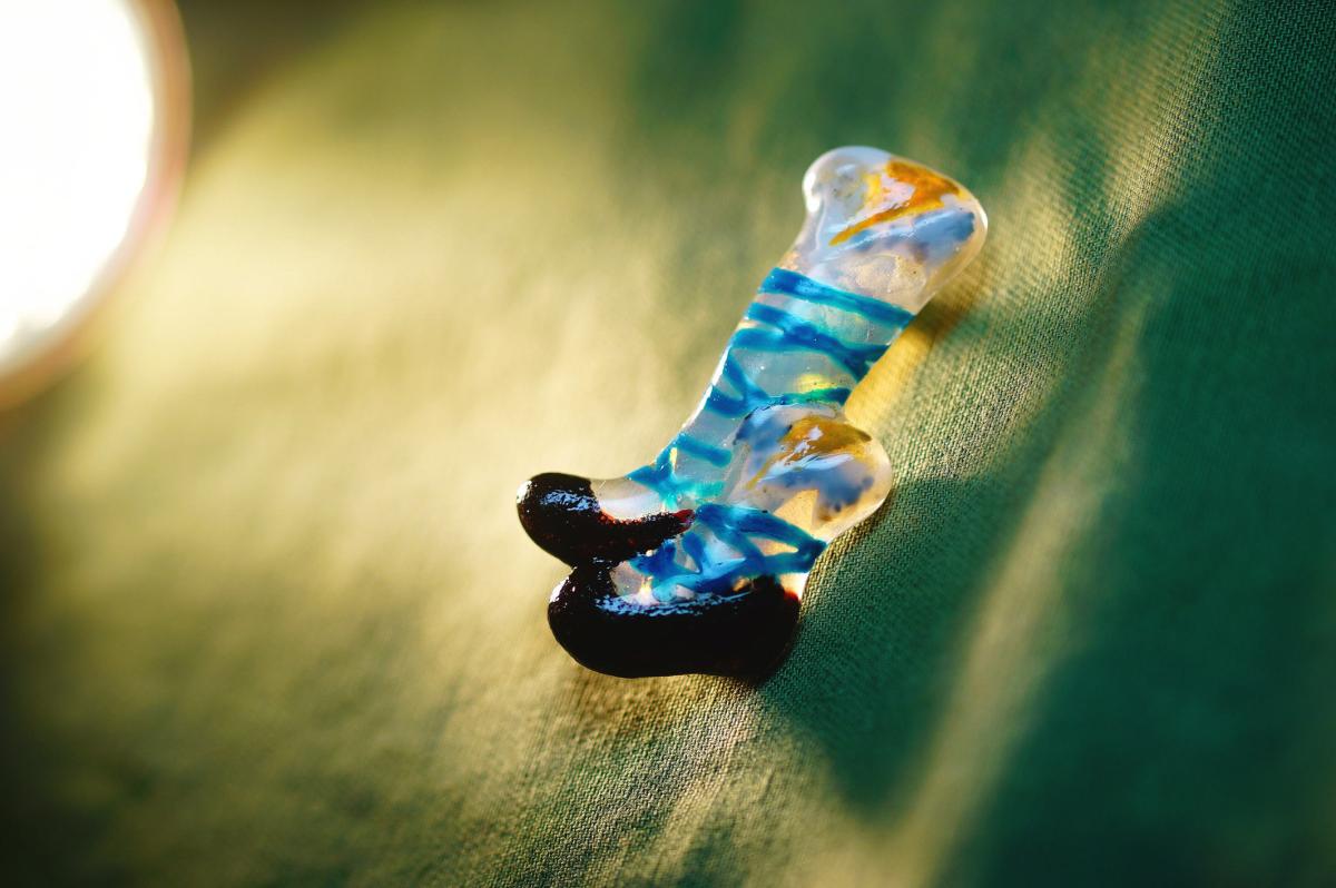 指輪を受け取りました!開封した瞬間、まるで魔道具の部品のような感じがしました。指輪としての形を超えて、ファンタジー世界に登場する装置のパーツのように感じたんです。手に取って見ると、ガラスの透明感が本当に美しく、光を透かすとまるで水の一部が固まったかのように見えます。特に赤いガラスが、泳いでいる小さな魚の群れのように見えて、幻想的で、花びらが流れるようにも見えました。