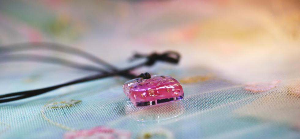 - 厚みを抑えたスクエアタイプのネックレスです。クリアーをベースに、可愛らしいピンク系のグラデーション加工を施し、全体に金の箔をちりばめています。さりげなく身に着けられる素敵なネックレスです。