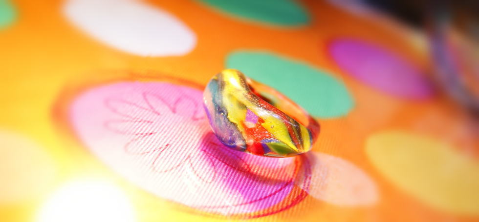 - 限定 : 1トップ部分はハートのフォルムに近い不定形のデザインリングです。内部は、数種類のカラーガラスを用いて雲のようなマーブリングを施しました。またトップ部分には優しく輝くゴールド形のラメも施しました。カラフルで存在感のあるリングです。艶やかなリングは、指にも馴染み肌にも大変優しいです。