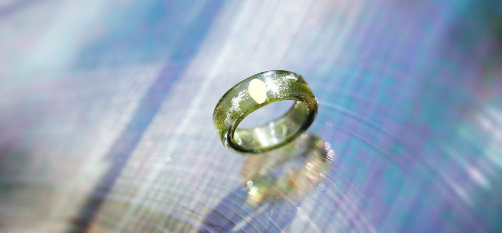 - 幅が一定のリングです。清流に泳ぐ鮎をイメージしました。特徴である模様や色合いをできるだけ表現し、内部に「思い出の大切なもの」も封入しました。また、シルバー系のラメを施し鮎の光沢ある姿も表現しました。透明感と優しさのある素敵なリングです。