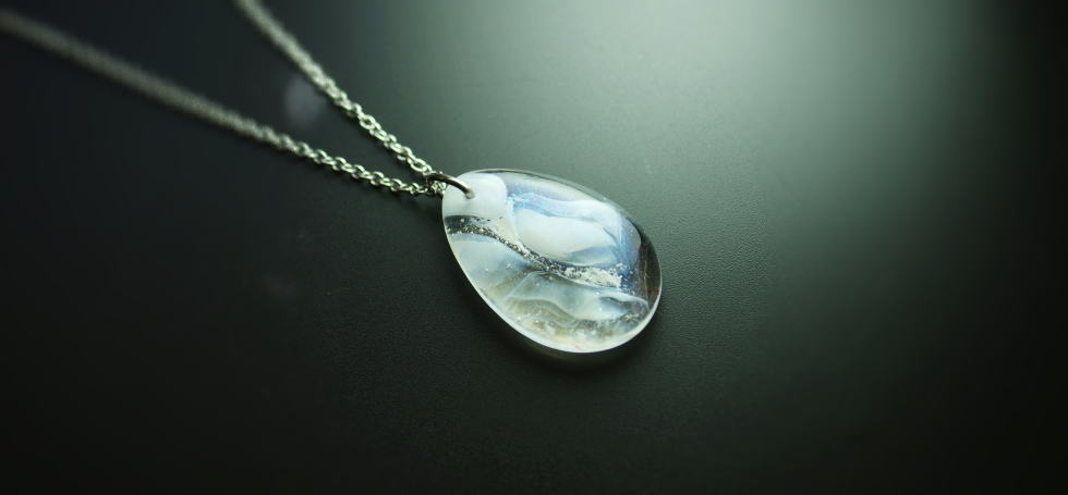 2907 『煌きの水雫』立体造形タイプ限定 : 1滑らかな四角柱と四角錐を組み合わせたような印象的なフォルム。その内部には、ライトスカイブルーのマーブル模様と共に、見る角度や光の当たり方で美しく色合いを変化させるダイクロ偏光ガラスの煌きを閉じ込めています。1mmφのナイロンコートステンレスワイヤーと合わせたスタイリッシュなイメージの、世界にひとつのオリジナルペンダントです。