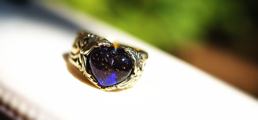 アメリカンガラス /青紫系 /イリデセント(ラメ)加工 / オリジナルデザインリング(ゴールドメッキ・燻し加工) Silver925製 /コラボレーションリング
