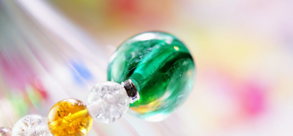 - メインの玉は、グリーン系を使用しています。また優しく輝くゴールドのラメを施し、全体的にマーブルデザイン加工をしています。ホタルの光のような神秘的で幻想的な蓄光の光を施しています。その他の玉は、カラフルなクラッキングビーズ仕様です。光が当たりますととても美しいです。写真の作品のメインの玉には、思い出の大切なものの封入加工をしています。