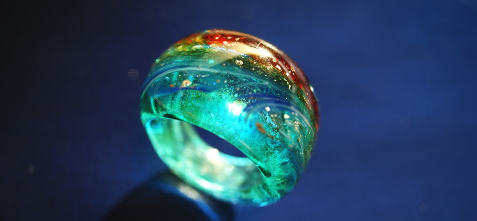 作品が完成したとのことでありがとうございます。また、「試作品確認ページ」において完成写真を拝見させていただきました。非常に素晴らしい作品ができてます!ネックレスは非常に温かみがあり、コメントにあるように元気が出てきます。これからの季節にはこのネックレスを見て触って寒い冬を乗り切れそうですね。サーフボードとの色合いが非常に良いですね。本当に元気が出ますね。リングの方はネックレスとはまた違う雰囲気で非常に神秘的な仕上がりになっていますね。イメージとピッタリです。海の色と夕焼けの色のコントラストが絶妙ですね。また、海面がキラキラ光るラメが散りばめられて素敵です。実は、イメージをお伝えしたあとに以前の作品を見てて「蓄光加工」というものを知ったのですが、「あ~!お願いすれば良かった...」と思っていました。が、作品を拝見させていただいたら蓄光加工をしていただいたようで非常に嬉しく思います。本当に素晴らしいものが出来たと思い本当に嬉しく思います。ありがとうございます。