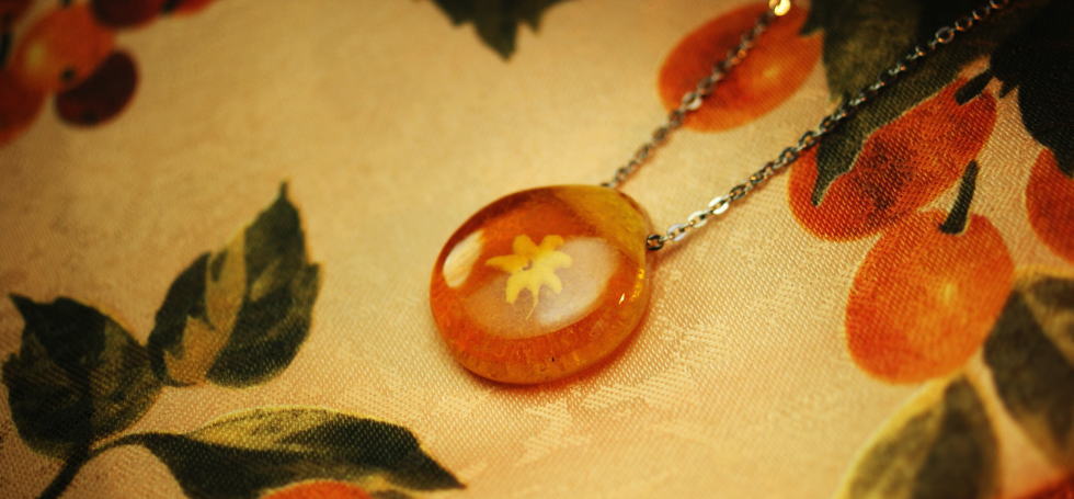 - 琥珀色の中に、白い百合をイメージして封入加工を致しました。優しさのあるドロップタイプネックレスが完成致しました。細かい気泡が全体に入っています。