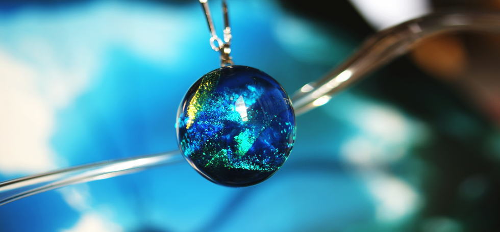 - 『Spiral glitte』と同じような球体ネックレス。ターコイブルーの球体の内部に、ガラスの王様と呼ばれているダイクロ偏光ガラスを螺旋状に細かく施しました。光に反射したり透過したりしますと、大変美しい煌きをご覧いただけます。手にとってご覧いただきますと、写真では判らない奥深い美しさを感じていただけます。
