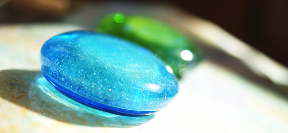 - 丸くドーム型の手のひらサイズのオブジェです。それぞれグラデーションにしています。表面には、ガラスの王様と呼ばれているダイクロ偏光ガラスラメを少し流すように施しています。写真の作品には封入加工を施しています。