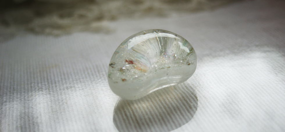2059 『勾玉 ~ 深き愛 ~』立体造形タイプ「思い出の大切なもの」を封入した勾玉タイプのオリジナルメモリアルペンダントです。透明感のあるライトグレーをベースに、ゴールド系に美しく煌くラメを全体に施した、落ち着きのあるイメージに仕上がりました。内部には神秘的な蓄光加工も施し、全体を鏡面になるまで時間を掛けて手磨きし美しく仕上げております。大切な存在をこれからもずっと身近に感じて頂ければ幸いです。