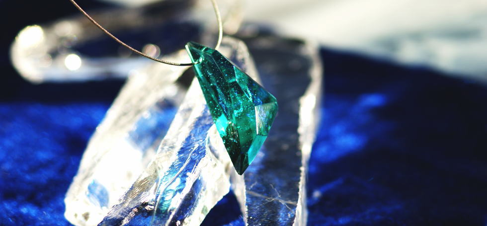 エメラルドのようなブルーグリーンをベースに使用した厚みのある不定形の立体のフォルムです。内部には、心奪われるようなダイクロ偏光ガラスの輝きをポイントに施しました。大胆なカットは光を様々に反射してとても美しいです。素敵に身に着けて闊歩してくださいね。 - 仕様: