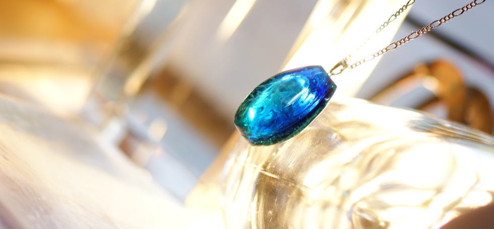 また、内部には光を吸収する度にターコイズブルーに神秘的に光る蓄光加工を施しました。ぜひ光を吸収させて暗所でご覧ください。何処にも無い素敵なペンダントが完成いたしました。 - 仕様: