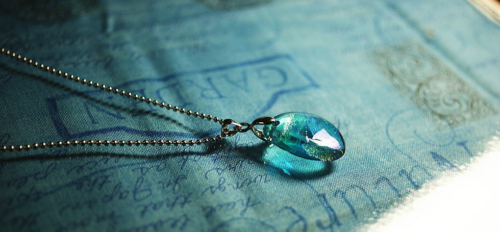 2102 『Dichroic planet width circle』立体造形タイプ水の惑星と呼ばれる地球の様に、もし水だけの惑星が存在したらこんな惑星になるのかもしれません。ターコイズブルーをメインに、内部にはガラスの王様と呼ばれているダイクロ偏光ガラスのブルーの輝きが大変印象的です。惑星の中心部分はクリアーのサークルが取り巻く様になっています。光を反射させても透過させてもとても美しく可愛らしい球体ネックレスです。