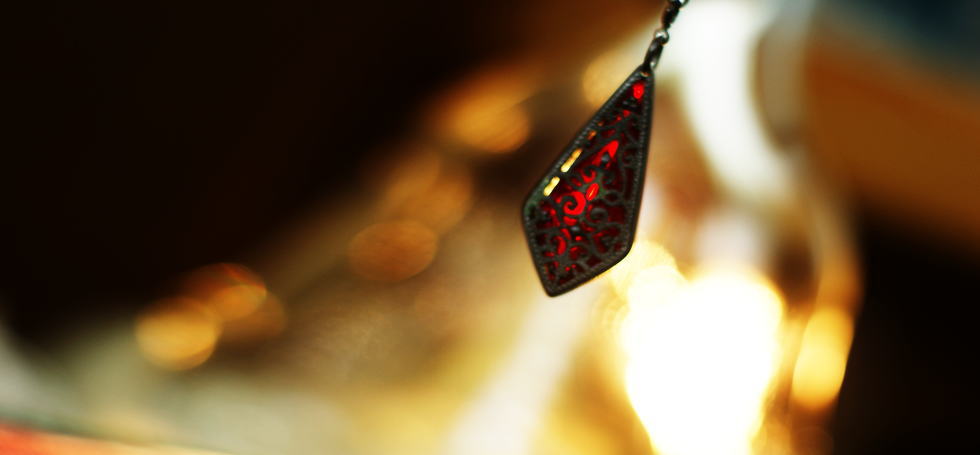 - 五面体の赤く透明のガラス素材をベースに、ガラスの王様と呼ばれるダイクロ偏光ガラスの青系をちりばめ何層にも施しました。光が当たりますと、とても美しく輝きます。赤の素材は淡い色合いを使用しています。ガラス部分をSilver925素材で囲み、裏面にはアラベスク模様のような透かし模様を施しました。とても細かな仕様で、とても素敵です。高貴なイメージの素敵な片耳用イヤリングに仕上がりました。Silver部分は、全体に燻し加工を施しました。金具部分のジョイントは外せるようにしていますので、イヤリングからネックレスペンダントのトップとしてもご愛用いただけます。様々な用途でご愛用くださいませ。