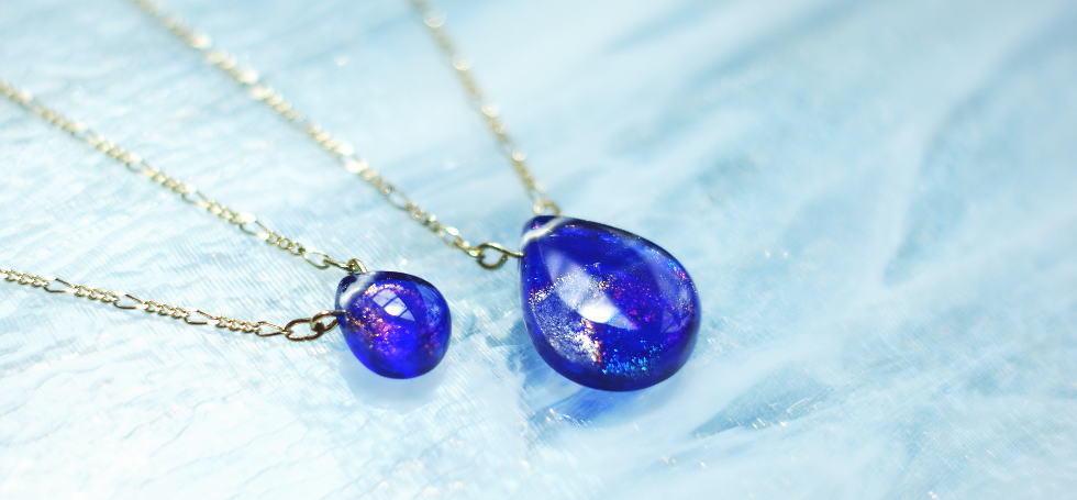 - コバルトブルーの色合いの素敵なドロップタイプのペンダントを、サイズ違いでお作りしました。表面内部には大変美しいレインボーラメを施しました。太陽光の下では一層美しく様々な色合いの輝きをご覧いただけます。また、内部には細かな星々が夜空いっぱいに神秘的に光る様蓄光加工を施しました。日中は美しく輝くラメを、夜には光を吸収して光る蓄光の神秘的な光をお楽しみください。素敵ネックレス・ペンダントが完成いたしました。