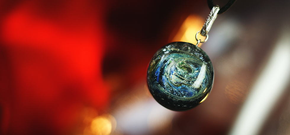 - その球体の内部には、まさに幾千の星が無数に煌めく銀河が広がり、見る角度や光の当たり方でその銀河は様々に表情を変えます。内部の銀河は、数種類のダイクロ偏光ガラスや純銀パウダー、そして蓄光を大変細かく繊細にマーブル加工しています。サイズは27mmほどと存在感ある神秘的で大変美しいペンダントに仕上がりました。