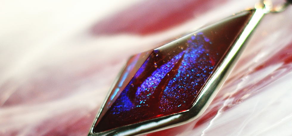 - 情熱的なレッドをベースに、シャープさのある面と頂点を最大限に追求し表現した素敵なフォルムの五面体ペンダントです。内部には、ブルー系をメインに美しく輝くガラスの王様と呼ばれる「ダイクロ偏光ガラス」で揺らぐようなイメージを表現しました。光の当たり方や見る角度で大変美しく偏光して輝きます。また、五面体を取り囲むようにSilver925素材で全体を囲み、裏面には素敵なアラベスク模様を施しました。透かしてご覧いただいても素敵です。様々な方向からお楽しみいただける大変素敵なコラボレーションペンダントに仕上がりました。