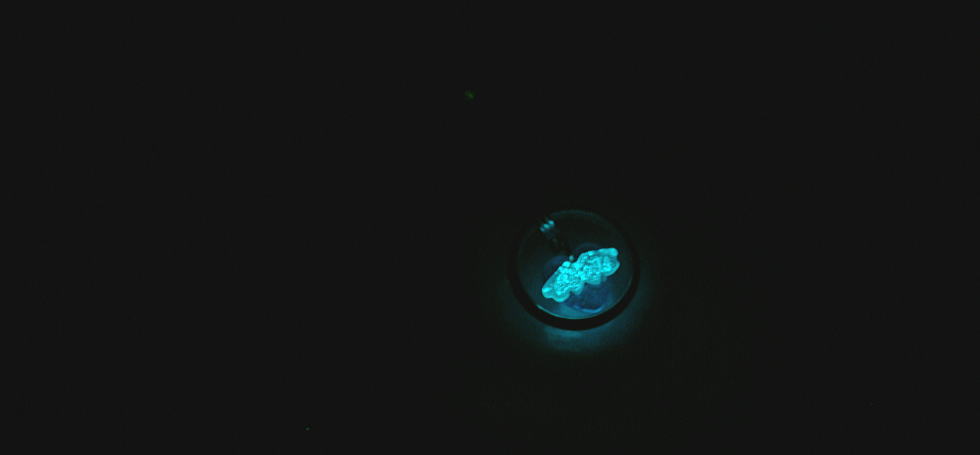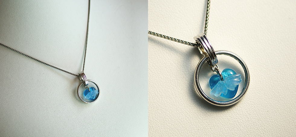 また、内部には光を吸収する度にターコイズブルーに神秘的に光る蓄光加工を施しました。ぜひ光を吸収させて暗所でご覧ください。何処にも無い素敵なペンダントが完成いたしました。