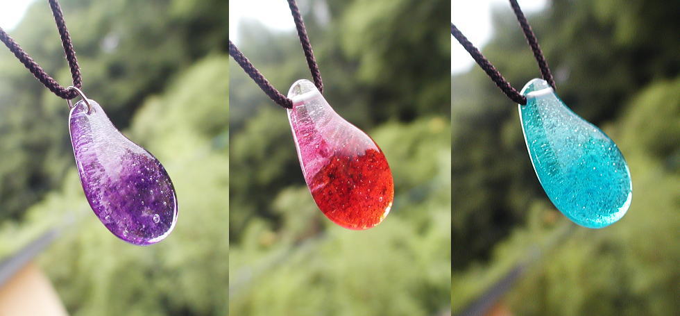 - ドロップタイプの少し変形したフォルムで、色違い3点のネックレストップ。一点はライトピンク系からレッドへのグラデーション。一点はライトバイオレットからディープパープルのグラデーション。一点はライトアクアマリンブルーからライトブルーへのグラデーションでお作りしました。少し変形させたフォルムが優しく可愛らしい感じの作品が完成いたしました。