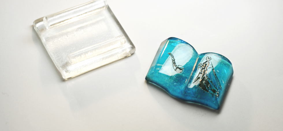 - 大切な思い出を見開きのフォルムの本に施してお作りいたしました。左に大切な思い出のパイプを、右にはご自身のウエディングドレス姿を彫刻し、黒の着色をしています。本全体は爽やかで美しいブルー系をベースにし、大変美しいガラスの王様と呼ばれているダイクロ偏光ガラスを数種類使用してのマーブルデザインにいたしました。また、内部全体には、光りを吸収する度に美しく神秘的に光るブルー系の蓄光を施していますので、光りを当てていただき暗所でご覧くださいませ。台座はシンプルなクリアーでお作りしています。いつまでも大切な思い出を身近に感じていただけましたら、大変嬉しいです。