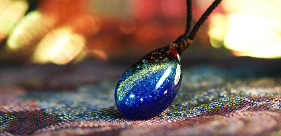 全体にブルーの濃淡のグラデーションを施し、赤を差し色に施しました。その中に一筋の流星をイメージしたガラスの王様と呼ばれるダイクロ偏光ガラスを施しました。光りの当たり方や見る角度でゴールド、グリーン、ブルーなどの美しい輝きをご覧いただけます。また、満天の星をイメージして細かな気泡と銀の箔をちりばめています。フォルムは全体に滑らかな丸みを持たせた立体的なドロップタイプでとても手触りが良く、神秘的な雰囲気の素敵なペンダントに仕上がりました。末永く大切な存在を感じながらご愛用いただけましたら、作り手といたしましても大変嬉しいです。 - 仕様: