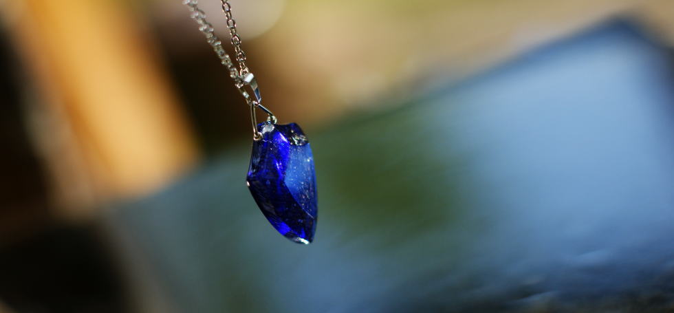優しいブルーの濃淡をひとつのかけらに閉じ込めました。かけらの中には、光に反射して輝く、ダイクロ偏光ガラスの美しい輝きが見えます。自然のフォルムをかけらにした、素敵なペンダントです。