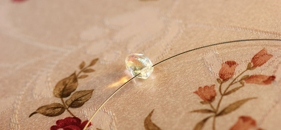 アメリカンガラス /約15×9×6mm /白系・透明 /ダイクロ偏光ガラス加工 / ワイヤーコード ステンレス製 40cm /-『煌きのつぼみ』は大変人気の高い作品でもとの作品は販売してしまいましたので、ご希望の方には同じイメージで受注制作にて丁寧にお作りしてまいります。一点ごと全て手作業での制作ですのでイメージや仕様などが変わってくる部分もございますが、作品の個性としてぜひお楽しみいただければ幸いです。