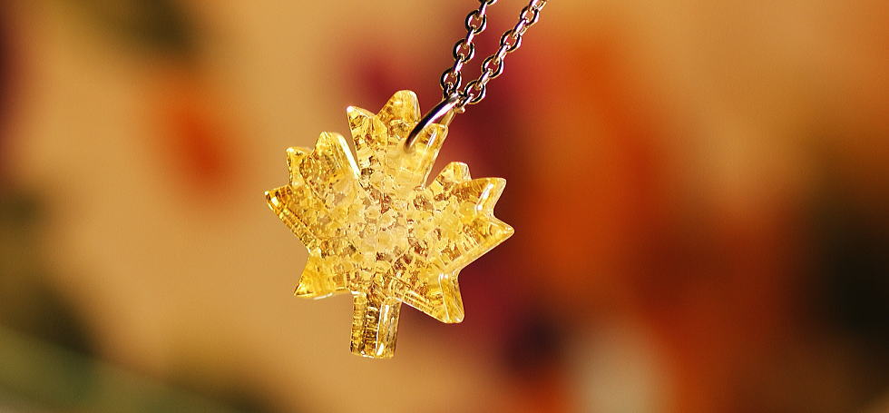 - カナダ国旗のメイプルリーフのフォルムの中に、最愛のリーフちゃんの可愛らしいお顔のイメージで、優しい色合いの琥珀色の濃淡を使用しグラデーションで表現いたしました。内部には、「思い出の大切なもの」を封入し、裏面には文字も彫刻をしております。