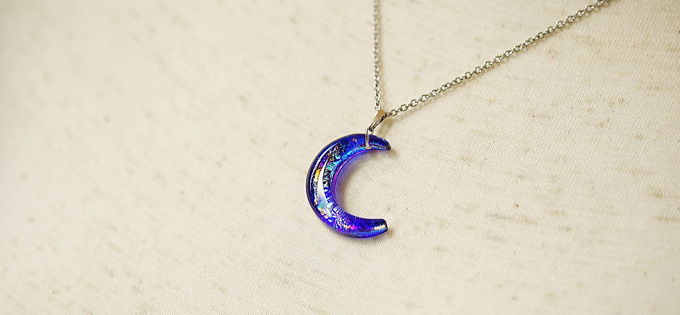 アメリカンガラス /約28×8×7.5mm /青紫系 /イリデセント(ラメ)加工 / あずきチェーン ステンレス製 /-『下弦の月 ~ 魅惑 ~』は大変人気の高い作品でもとの作品は販売してしまいましたので、ご希望の方には同じイメージで受注制作にて丁寧にお作りしてまいります。一点ごと全て手作業での制作ですのでイメージや仕様などが変わってくる部分もございますが、作品の個性としてぜひお楽しみいただければ幸いです。