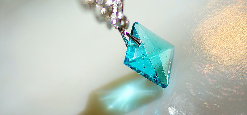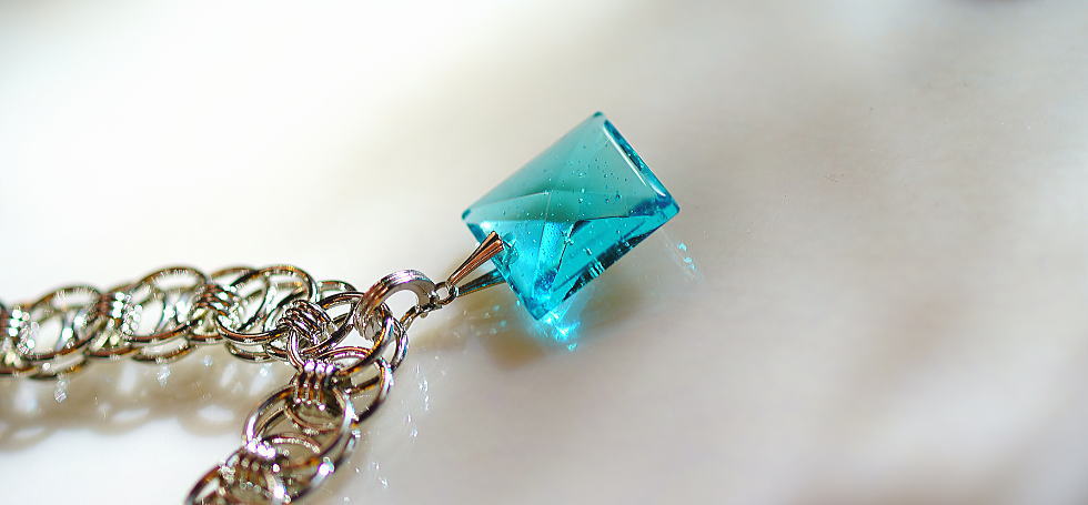 - 限定 : 1清らかな水の結晶。アクアブルーの四角形のフォルムに多面体のカットを施した印象的なトップは、光に反射して煌きます。特徴的なリングデザインチェーンと組み合わせて、チョーカーとしてお使いいただけるようにお作りいたしました。