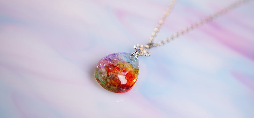 アメリカンガラス /約24×20×8mm /赤系オレンジ系黄色系黄緑系緑系青系青紫系紫系赤紫系白系・透明 /イリデセント(ラメ)加工 / グラデーション加工 /気泡加工 / あずきチェーン シルバー色 45cm /-『陽だまりの中で ~ 桃源郷 ~』は大変人気の高い作品でもとの作品は販売してしまいましたので、ご希望の方には同じイメージで受注制作にて丁寧にお作りしてまいります。一点ごと全て手作業での制作ですのでイメージや仕様などが変わってくる部分もございますが、作品の個性としてぜひお楽しみいただければ幸いです。