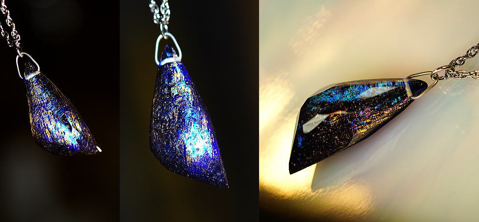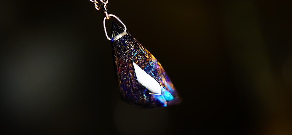 また、内部には光を吸収する度にターコイズブルーに神秘的に光る蓄光加工を施しました。ぜひ光を吸収させて暗所でご覧ください。何処にも無い素敵なペンダントが完成いたしました。