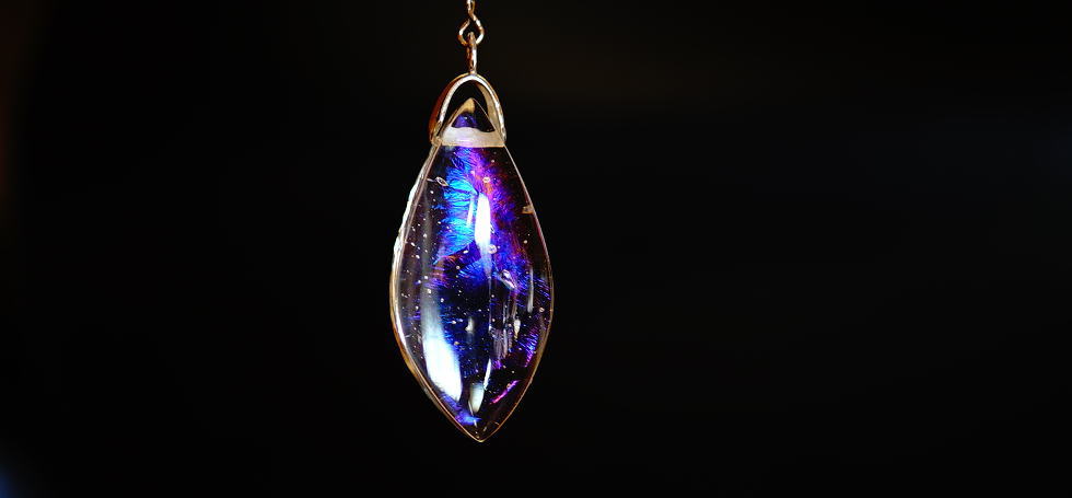 今日受け取りました。夜なので、まだ陽光の下で見れていないのですが、それでも不思議な紫や青の光の揺らめきが見え、本当にオーロラや宇宙の光を閉じ込めた雫のようです。明日にさっそく付けて出勤しようかと思います。また、丁寧な梱包、お手入れの仕方も書いたお手紙ありがとうございました。大変満足しています。今後も素敵な作品を見せていただけますよう、楽しみにしています。id:1273 Written by. yuuka さん女性♀