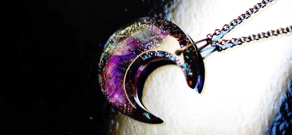 - 透明感のある雰囲気の中に、美しいダイクロ偏光ガラスの煌きとグリーン系やパープル系の流れを施しました。見る人を一瞬にして魅了する神秘的な雰囲気をまとった、世界に一つの下弦の月(三日月)タイプのメモリアルペンダントに仕上がりました。