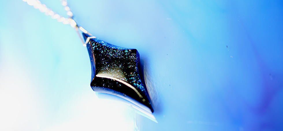 2610 『雪姫のBlue tear』しずくタイプ優しい雪姫のピュアな涙色。その涙にはどんな思いが込められているのでしょう。透明感のある美しいアクアマリンブルーやターコイズブルーに、ダイクロ偏光ガラスの煌きを美しいマーブル模様で表現しました。透明感溢れる世界にひとつの素敵なしずくタイプペンダントに仕上がりました。