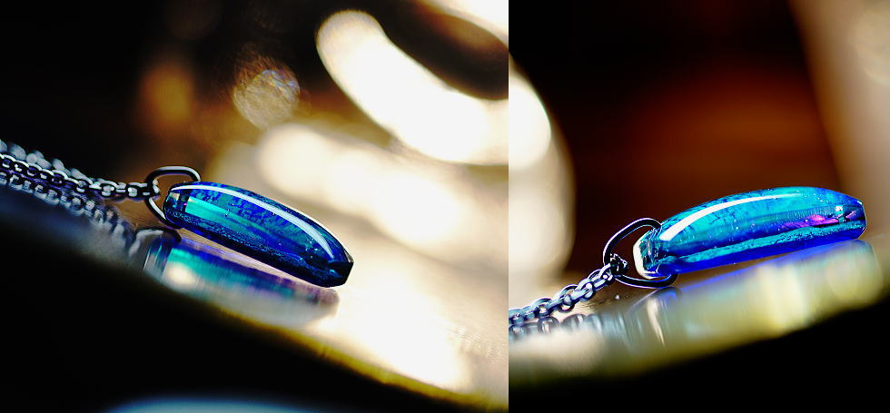 アメリカンガラス /約36×24×11mm /青系 /イリデセント(ラメ)加工 / 蓄光加工 / あずきチェーン ステンレス製 50cm 太め /-『翠華』は大変人気の高い作品でもとの作品は販売してしまいましたので、ご希望の方には同じイメージで受注制作にて丁寧にお作りしてまいります。一点ごと全て手作業での制作ですのでイメージや仕様などが変わってくる部分もございますが、作品の個性としてぜひお楽しみいただければ幸いです。