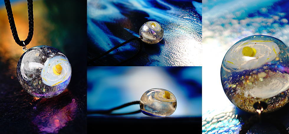 - 宇宙のワンシーンを表現した存在感のある立体的な扁平の球体ペンダントが完成いたしました。参考にされたベースの作品のイメージを大切に、ラフォルム独自の手法により、また一味異なる仕上がりでお作りしてまいりました。内部には煌くラメやダイクロ偏光ガラス、そして金箔・銀箔、さらに蓄光加工などを施したラフォルムオリジナルオーダーメードペンダントに仕上がっております。ぜひ末永くお楽しみいただければ幸いです。