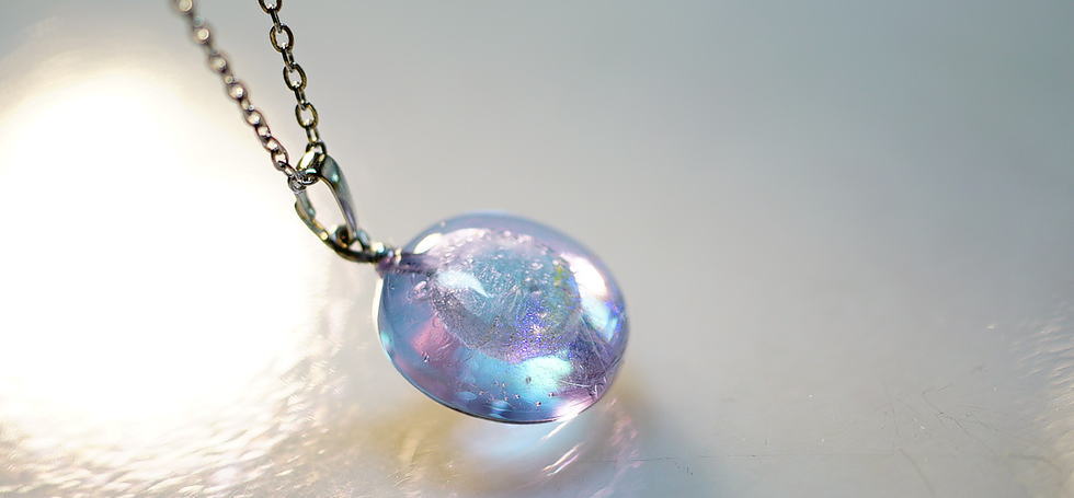 - 春の優しく淡い桜色の空。色の変化をお楽しみいただけるネオラベンダーをベースに、日の光のような煌きを下部に施しました。円形ドーム型のフォルム、ガラスの内部空間に、わんちゃんの「思い出の大切なもの」を封入してお作りした、世界に一つのメモリアルペンダントが完成いたしました。これからもぜひ大切な存在を身近に感じ、少しでもお心の支えとしていただければ、作り手として大変嬉しく思います。