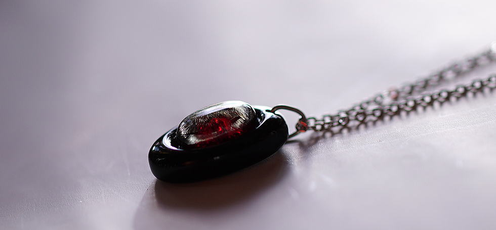 アメリカンガラス /約28×20×10mm /赤系黒系 /イリデセント(ラメ)加工 / メモリアル封入加工 / あずきチェーン ステンレス製 45cm /-