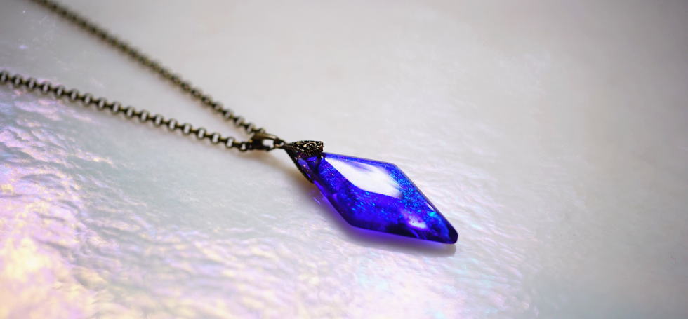 - 限定 : 0コバルトブルーをベースカラーに、ブルーからパープル系の美しいラメの煌きを閉じ込めた、滑らかなフォルムのひし形ペンダントです。アンティークゴールド色の金具パーツをお付けしておりますので、性別を問わずお楽しみいただけそうな逸品に仕上がりました。