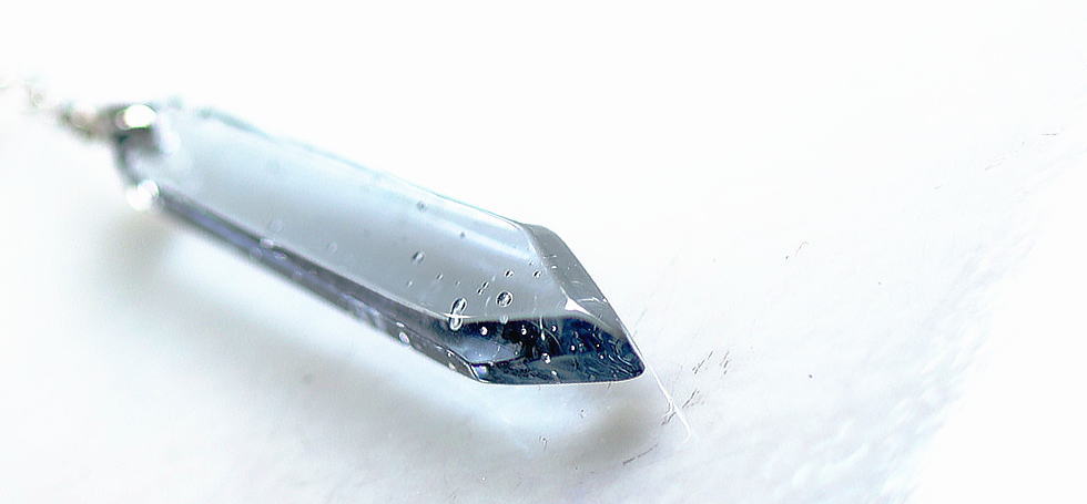 - シャープな剣のようなフォルムとブルーグレーの、シンプルでスタイリッシュな片耳用ピアスが完成いたしました。鋭利なカットと面造形が光に煌く、ガラス本来の美しい透明感をお楽しみいただける逸品に仕上がっております。どうぞ末永くお楽しみいただければ幸いです。