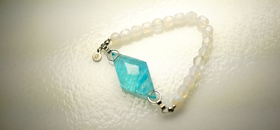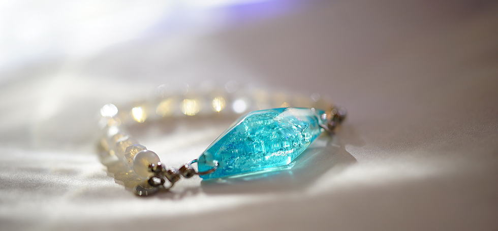 - 美しい遠浅の南の海のような、透明感や色合いが美しい世界にひとつのオリジナルメモリアルブレスレットが完成いたしました。アクアブルー系の美しい色合いにさざなみのようなマーブル模様とブルー系の煌きを施しました。そのひし形のガラストップの中に「思い出の大切なもの」を封入し、裏面には文字を施しております。暗闇でもお楽しみいただける蓄光加工も施しております。また周囲の小さな半透明(乳白色)のガラスビーズも数種使用して、ゴム仕様にてお作りいたしました。どうぞ末永くお楽しみいただければ幸いです。
