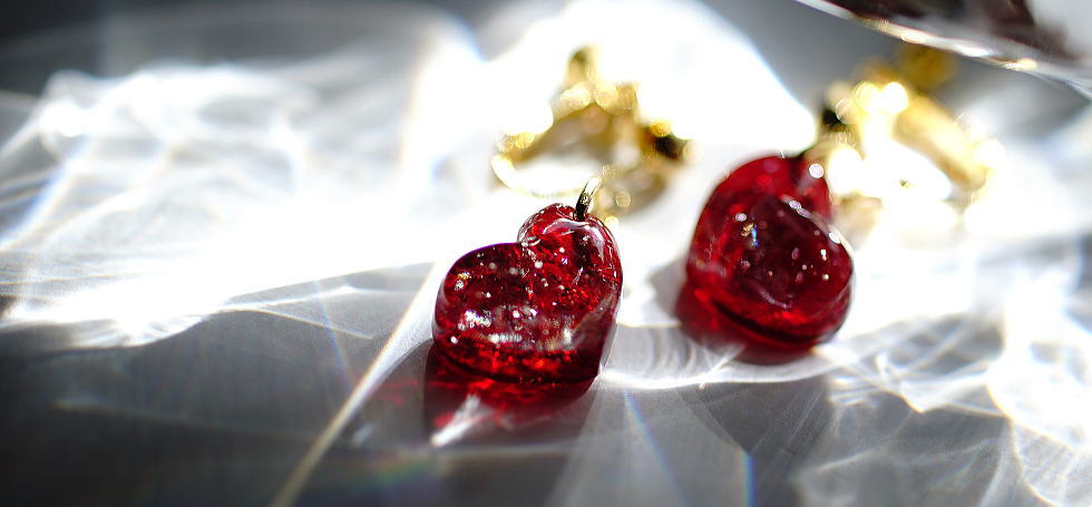 - ふっくらとした可愛らしいハート形のトップが美しい、世界にひとつのオリジナルメモリアルイヤリングが完成いたしました。赤系の色合いとゴールドの煌き、その内部に「思い出の大切なもの」を封入してお作りしております。大切な存在を末永く身近に感じていただければ幸いです。