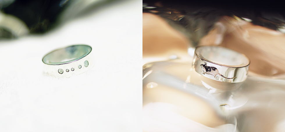 - パンダマウスのシルエットなどを表現しお作りした、世界にひとつのコラボレーションリングが完成いたしました。淡い紫系のラベンダーカラーと淡いピンク系の優しいグラデーションのガラスリング。紫外線の強さによりその色合いが変化します。その周囲をSilver925製の彫金リングで囲み、マウスのシルエットを抜いてガラスリングが見えるようにしております。その反対側には5個の丸いシルエットも表現しました。暗闇での蓄光の光もお楽しみいただける逸品に仕上がっております。