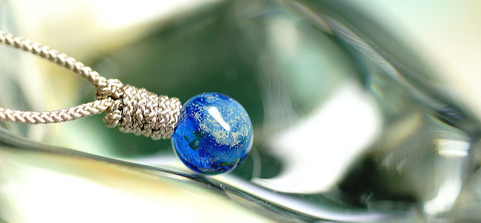 - 宇宙から見た青い惑星のように雲や光の煌きに満ちています。シンプルな球体のフォルムが素敵な世界にひとつのオリジナルペンダントが完成いたしました。前後面で表現を変えたリバーシブルタイプとなっております。暗闇でも神秘的な雰囲気をお楽しみいただける逸品です。どうぞ末永くお楽しみください。
