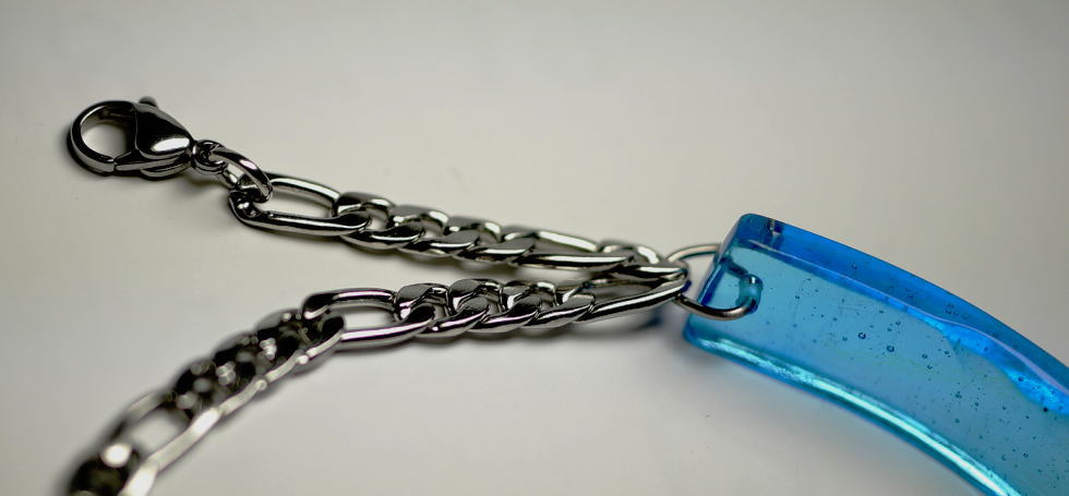 - 赤と青の対比する2つの世界。緩やかな丸みを持たせたプレート状の長方形のフォルム。表面は滑らかに、そして裏面側にランダムなカットを裏から一部に施して厚みの変化を意図的に発生させ、造形的な面白さと色の透過による変化の両方を同時にお楽しみいただけます。内部にラメと「ダイクロガラス」の美しい煌きを施しました。「ダイクロガラス」は一部分に施して煌きの変化をお楽しみいただける仕様です。2つの趣のあるトップをお楽しみいただける世界にひとつのオリジナルブレスレットが完成いたしました。お好きな長さにチェーンの長さを調整可能です。