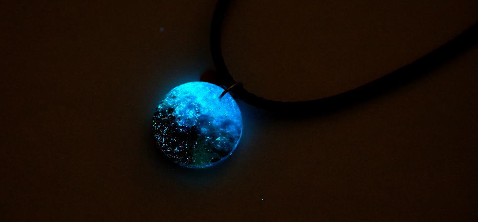 1838 『限りない想い』円・楕円・ドロップタイプ『Oasis ~ Aqua Drop ~』のようなグラデーションで、形は『My lovely bird』のイメージ。内部には球体風の部分があり、封入と蓄光を施したペンダントです。全体は、淡いブルーから濃い目のブルーへとグラデーションに致しました。内部には、地球が宇宙に浮いているような感じで、封入と蓄光を施しました。とてもさわやかな感じの作品が完成いたしました。