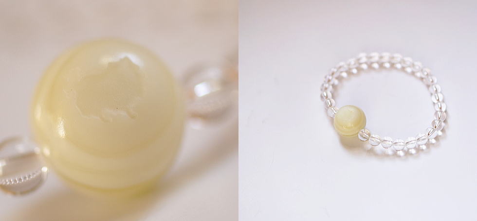 - メインのクリーム色の優しい色味の珠の中に「思い出の大切なもの」を封入した、世界にひとつのオリジナルメモリアルブレスレットが完成いたしました。周囲には天然石の水晶玉(6mm)を使用しております。メインの珠にはわんちゃんのお写真からシルエットを作成し彫刻しております。ゴム仕様で身に着けやすい仕上がりです。ぜひこれからも末永く大切な存在を身近に感じていただければ幸いです。