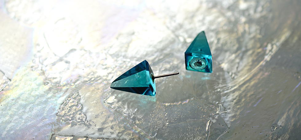 - 透明感溢れる八面体『Standard Dreamblue』を横に半分にカットし四角錐のフォルムを制作、ピアス金具を設置してセパレートタイプピアスとしてお作りいたしました。耳に挟むようなイメージで装着しますので、まるで八面体のフォルムそのものを付けているような不思議な感覚の素敵な逸品となりました。同様のフォルムで、レッド・オレンジ・イエロー・グリーン・ターコイズブルー・コバルトブルー・パープル・クリアー・ホワイト・チャコールグレーの10色で、色味を変えてお作りすることも可能です。