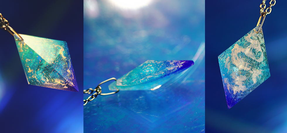 - ブルーの濃淡、煌き、暗闇での光の表情。その全てが、独自の世界観を生み出す美しい八面体ペンダントが完成いたしました。大ぶりだったベース作品を一回り小ぶりサイズで表現した印象的な八面体のフォルム。その内部に広がる「水と氷の世界」。表裏で異なる表情をお楽しみいただける逸品です。