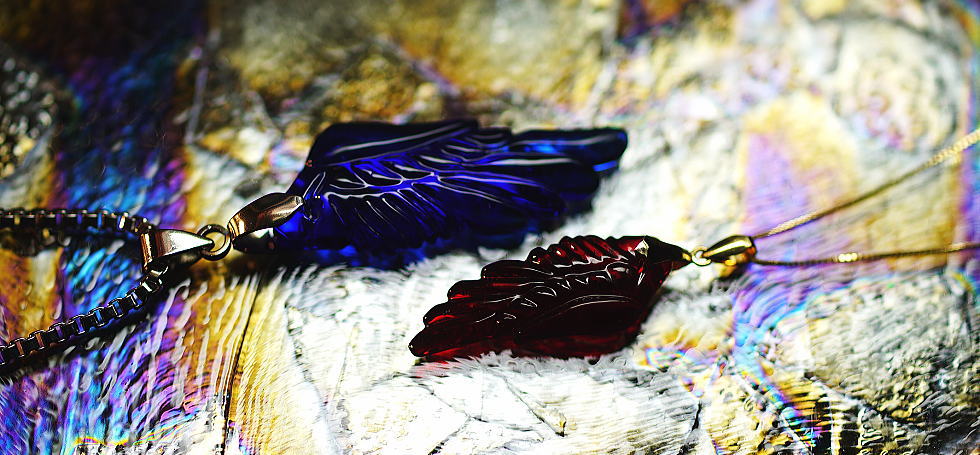 - 猛禽類の羽のフォルムを、青と赤の2種類の色味とサイズで再現した世界に一組のオリジナルペアペンダントが完成いたしました。女性用の赤は小ぶりで繊細な仕上がりでK18製金具パーツを設置しております。男性用の青は一回り大きめサイズで仕上げております。チェーンはステンレス製のベネチアンチェーン3mmのものを設置いたしました。これからもこの作品を通して様々な思い出を作って行っていただければ作り手としても大変嬉しく思います。