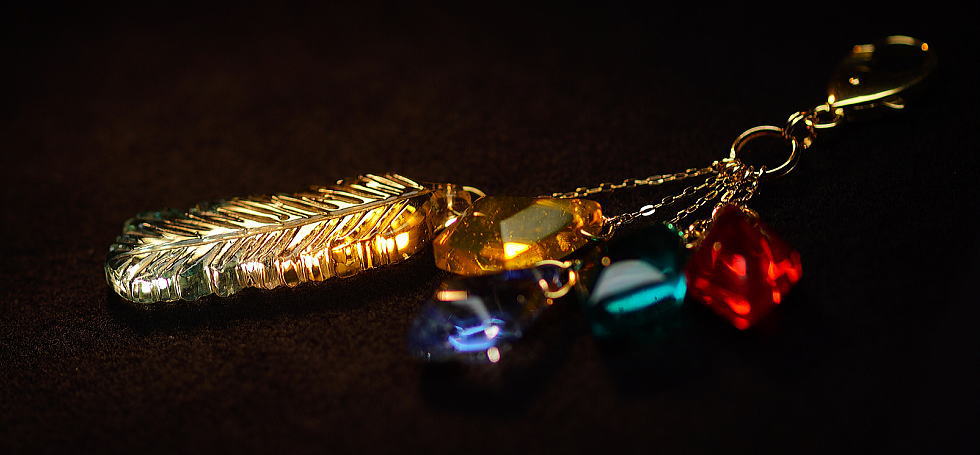 - ずっと思い描かれたイメージを形にした世界にひとつのオーダーメイドキーホルダーが完成いたしました。色合いの異なる表裏立体の変形ひし形トップを4つ、さらにイエロー~淡いブルーへのグラデーションの羽根のモチーフを作成し、全ての金具パーツをK18製でご用意して設置しております。繊細且つ存在感のある逸品をぜひこれからも末永くご愛用いただければ幸いです。